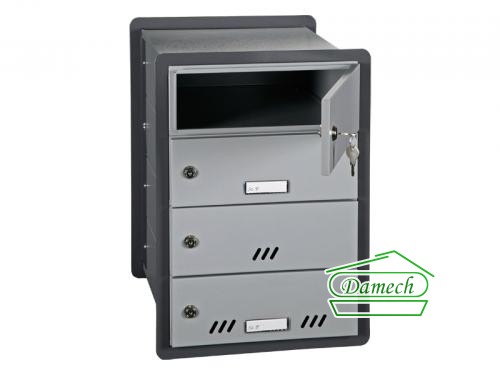 Skrzynka nieprzelotowa przeznaczona do zabudowy w przegrodzie budowlanej, wewnątrz budynków mieszkalnych. Wrzut korespondencji odbywa się krótszym bokiem przez odchylenie klapki do góry na zewnątrz skrzynki. Drzwiczki otwierają się na bok.